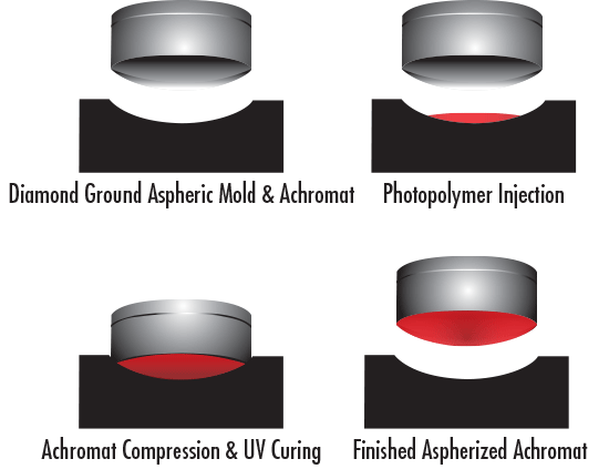 混合成型,以如消色差透鏡的一個標準球面表面為基底,通過包含了一薄層光敏聚合物的非球面模造,將該球面表面壓鑄成型,*終生產(chǎn)出一個非球面表面。這項技術(shù)采用一個鉆石磨砂非球面模造和一個玻璃消色差透鏡(雖然也可以使用其他類型的單片透鏡和雙合透鏡),在非球面模造內(nèi)注入光敏聚合物,再讓非球面模造將球面表面壓鑄成型。*后,此技術(shù)通過在室溫壓縮和UV固化這兩個表面,產(chǎn)生一個非球面消色差透鏡。該透鏡的光學屬性結(jié)合了其所組成部件分別所展示的光學屬性:消色和球面像差校正。圖7為混合透鏡的制作過程。混合成型非常適用于高批量高精密的應用,這些場合除了需要極高性能之外,也可以通過批量生產(chǎn)所獲得的成本節(jié)約抵消其高初始工具成本。更多有關(guān)使用混合流程制作非球面消色差透鏡的信息,請參閱為什么使用消色差透鏡?。
