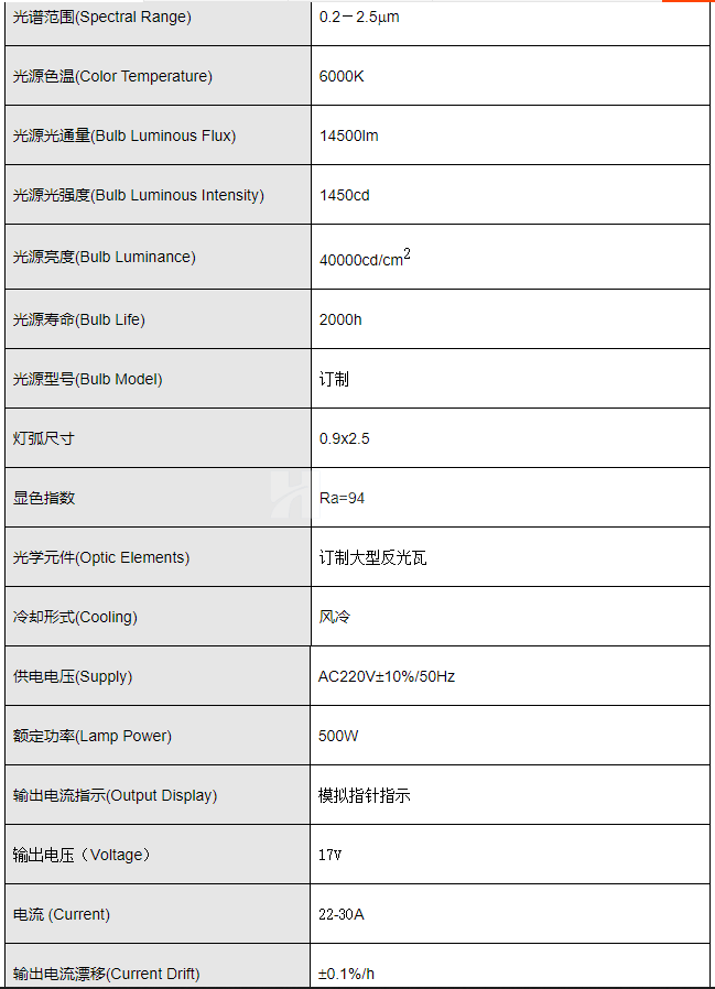 大面積太陽模擬器光源采用光譜與太陽光近似的短弧氙燈作為光源,由6只短弧氙燈組成,每只氙燈均采用特殊的光學(xué)設(shè)計(jì),使光斑的均勻性有很好的保證。