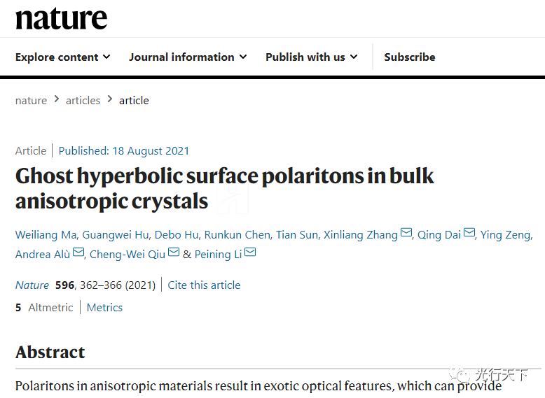 近日,國際頂級(jí)期刊《自然》刊發(fā)了華中科技大學(xué)武漢國家光電研究中心/光學(xué)與電子信息學(xué)院李培寧教授和張新亮教授研究團(tuán)隊(duì)題為《Ghost hyperbolic surface polaritons in bulk anisotropic crystals》的研究論文。李培寧、張新亮教授團(tuán)隊(duì)同新加坡國立大學(xué)、國家納米科學(xué)中心、紐約州立大學(xué)等單位合作,突破性證明了傳統(tǒng)的雙折射晶體中存在“幽靈”雙曲極化激元電磁波,該成果革新了極化激元基礎(chǔ)物理的“教科書”定義,對(duì)凝聚態(tài)物理、光物理、電磁學(xué)等領(lǐng)域的基礎(chǔ)原創(chuàng)研究具有重要指導(dǎo)意義。