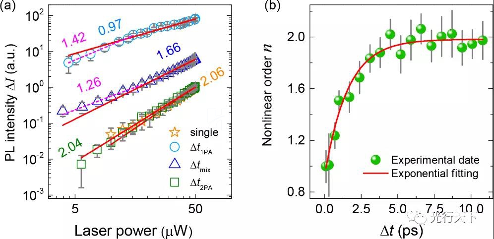 研究工作同時(shí)表明,通過精確調(diào)控兩束飛秒激光的延遲,可以精準(zhǔn)地調(diào)控飛秒激光與金納米粒子相互作用的非線性系數(shù)。如 圖2所示,使用單束飛秒脈沖激發(fā)金納米粒子時(shí),其熒光表現(xiàn)出明顯的雙光子吸收過程,非線性系數(shù)為2;在采用雙脈沖激發(fā)時(shí),當(dāng)僅改變其中一束飛秒激光功率時(shí),金納米粒子的熒光隨兩束脈沖延遲的增加呈現(xiàn)出從線性過程向雙光子過程漸變的奇異行為。在金納米粒子的實(shí)際應(yīng)用中,線性過程更適用于精密測量與傳感,而高階非線性過程對(duì)超分辨成像更有利。