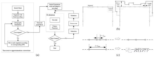 圖1. (a)優(yōu)化算法流程 (b)自適應分段策略樣例 (c) 自適應分段的合并與分裂