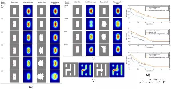 圖2. (a)對不同大小的基板缺陷的補償仿真結(jié)果 (b) 對不同位置的基板缺陷的補償仿真結(jié)果 (c) 對復雜圖形的基板缺陷的補償仿真結(jié)果 (d) 對不同位置的基板缺陷的補償、使用不同優(yōu)化算法,目標函數(shù)收斂速度的比較
